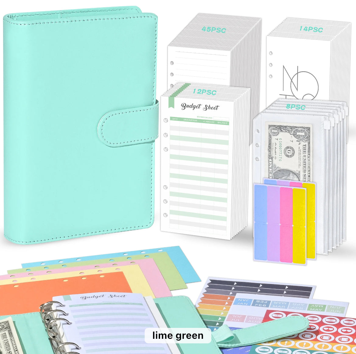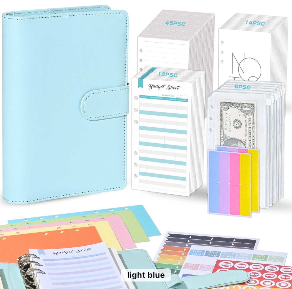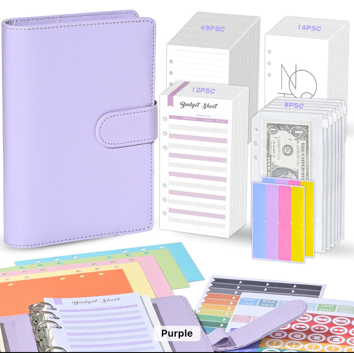 Organize your finances with ease using our Budget Binder. This all-in-one kit includes 8 cash envelopes, 12 budget sheets, 45 note sheets, 14 calendar sheets, 3 sheets of stickers, 5 dividers, Label stickers and personalized name with a heart. Stay on track and achieve your financial goals with this essential tool.